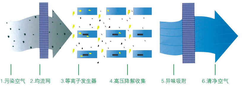 采用低溫等離子體分解油霧、廢氣等污染介質時,等離子體中的高能離子起決定性的作用。流星雨狀的高能離子與介質內(nèi)分子(原理)發(fā)生非彈性碰撞,將能量轉化成基態(tài)分子(原子)的內(nèi)能,發(fā)生激發(fā)、離解、電離等一系列過程使污染介質處于活化狀態(tài)。污染介質在等離子體的作用下,產(chǎn)生活性自由基,活化后的污染物分子經(jīng)過等離子體定向鏈化學反應后被脫除。當離子平均能量超過污染介質中化學鍵結合能時,分子鏈斷裂,污染介質分解,并在等離子發(fā)生器吸附場的作用下被收集。在低溫等離子體中,可能發(fā)生各類型的化學反應,這主要取決于等離子的平均能量、離子密度、氣體溫度、污染物介質內(nèi)分子濃度及共存的介質成分。
